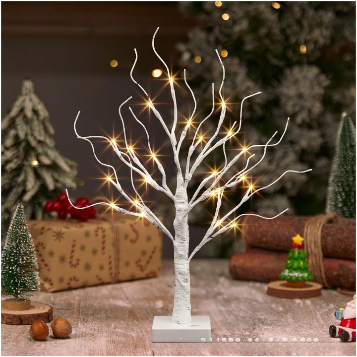 This 2-foot faux birch tree lamp features a natural bark-like texture with 24 warm white LEDs. It creates a soft, enchanting atmosphere that blends rustic charm with modern lighting for both indoor and outdoor settings.