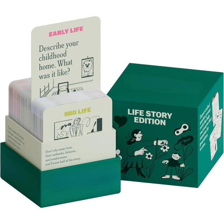 This set includes 150 expert-crafted questions, a simple interviewing framework, and recording tips & tricks. Turn any gathering into shared laughter, meaningful memories, and conversations no one wants to end.
