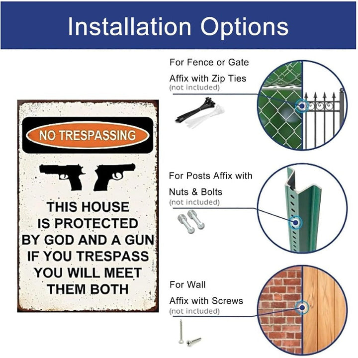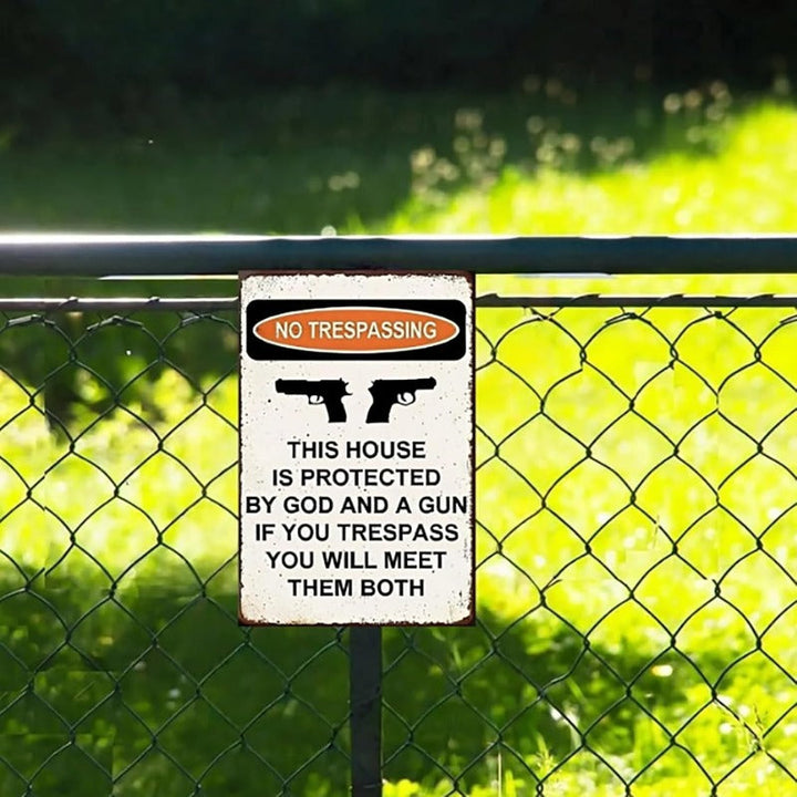 Show your beliefs and protect your property with this durable No Trespassing Metal Sign. Featuring bold black letters and a vintage weathered look, it sends a clear message with a touch of American humor: “This house is protected by God and a gun. If you trespass, you will meet them both.”